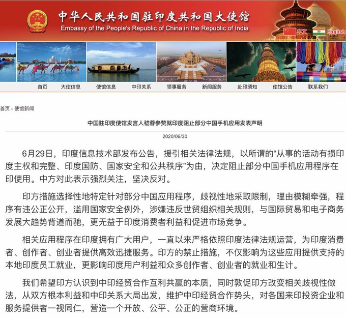 方舟子@fangshimin·Jun 30中国驻印度大使馆声明,印度阻止部分中国手机应用“涉嫌违反世贸组织相关规则,与国际贸易和电子商务发展大趋势背道而驰,更无益于印度消费者利益和促进市场竞争。”谷歌、推特、脸书、YouTube、Instagram、Telegram……这些墙内不存在的网站听了作何感想?https://pbs.twimg.com/media/Eb0g-j5UEAA-dmL?format=jpg&name=small