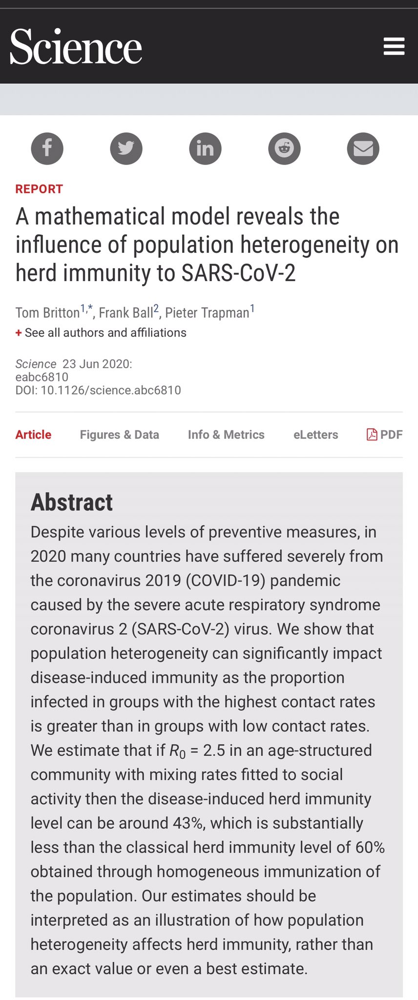 方舟子@fangshimin·Jun 24《科学》一篇论文,认为如果考虑不同年龄段的传播情形,只要43%的人被新冠病毒感染就达到群体免疫了。https://pbs.twimg.com/media/EbUiHi0U4AM8cpd?format=jpg&name=large