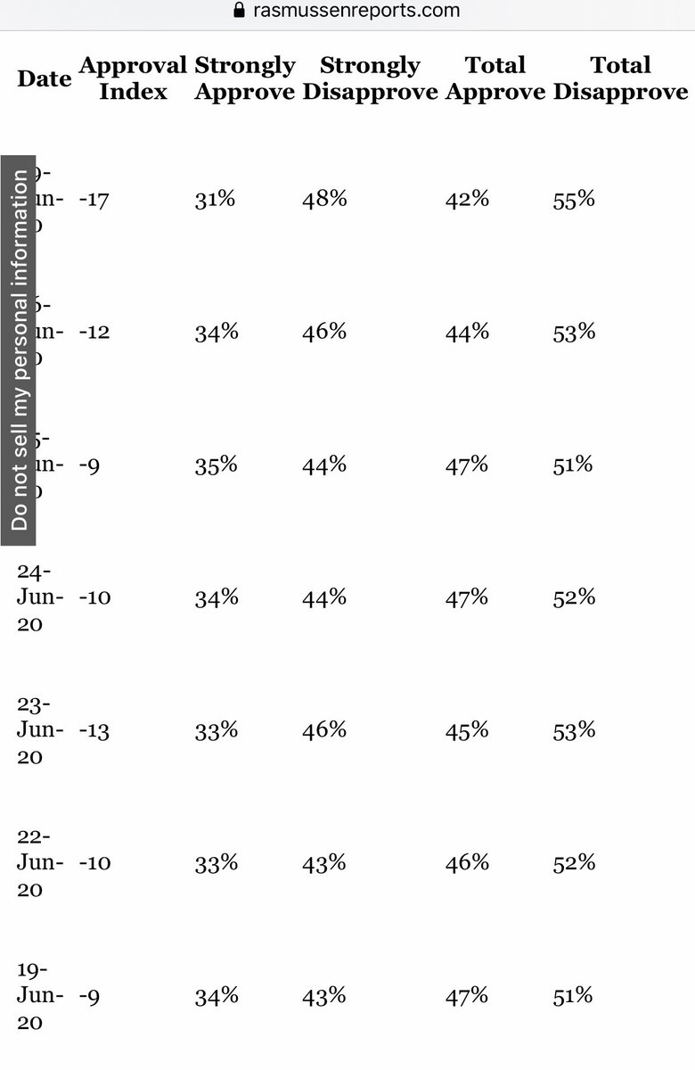 方舟子@fangshimin·Jun 29川普唯一公开认同的民意调查、偶尔让川普支持率达到50%他就兴奋地转发的拉斯姆森民意调查今天给出川普的支持率是创纪录低的42%,与其他民意调查结果一致了。等着川普骂它也是假调查。https://pbs.twimg.com/media/Ebt6M_8VcAAdrkX?format=jpg&name=medium