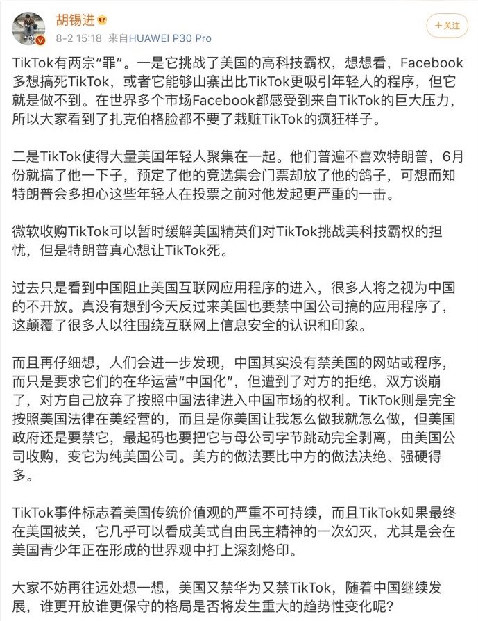 方舟子@fangshimin·Aug 3字节跳动曾游说美国国会,说踢踏(TikTok)忠于美国而不是中国。为什么胡锡进、环球时报这么维护一个忠于美国的产品?反了?https://pbs.twimg.com/media/EejttilU0AE2fqk?format=jpg&name=900x900