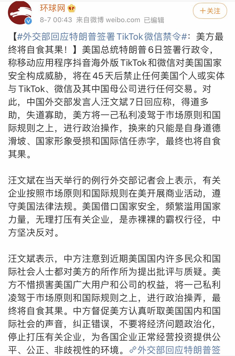 方舟子@fangshimin·Aug 6不是45天之后禁止美国人使用抖音和微信(美国政府没这个权力),是45天之后禁止美国人或公司跟它们做交易,也就是说在45天内它们要么卖给美国公司要么退出美国市场。https://pbs.twimg.com/media/EezBFcDU8AAVCix?format=jpg&name=medium