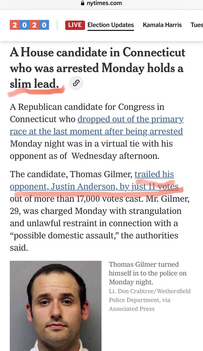 方舟子@fangshimin·Aug 12康乃狄格州一个共和党众议员候选人在党内初选的前一天晚上因为家暴被捕,他匆忙宣布退出竞选,投票结果,《纽约时报》标题说他微弱领先,正文却说他落后11票,忘了改标题了吧?https://pbs.twimg.com/media/EfQNJZLU8AASS9h?format=jpg&name=medium