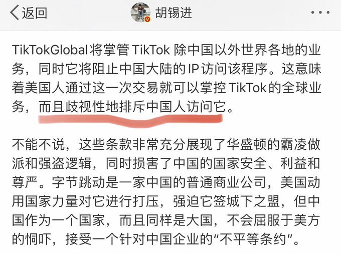 方舟子@fangshimin·Sep 23胡锡进说如果美国公司掌管了TikTok,就可以“歧视性地排斥中国人访问它”,但是在美国掌管之前,中国人就已经访问不了它了,这意思是只许中国公司歧视中国人,不许美国公司歧视?如果美国公司掌管了TikTok而且解除了对中国的屏蔽,我敢说中国也马上会自己把它屏蔽掉。https://pbs.twimg.com/media/Eilcv8UU8AAdZcc?format=jpg&name=small