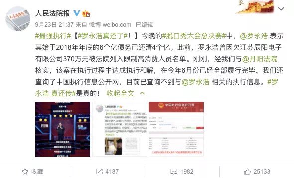 阳光宝盒@lianrcsy·Sep 24Replying to @fangshimin其实我也怀疑还了4亿,他的直播一次才多少钱?怎么可能有4亿。要么夸大债务,要么夸大还款能力。不过另一方面我也相信老罗