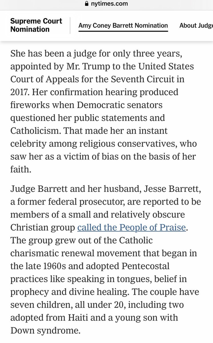 方舟子@fangshimin·Sep 25川普即将提名的新大法官巴雷特不仅反对任何时期、任何情况下的人工流产,认为即使早期堕胎也是谋杀(她自己有一个唐氏综合征子女,认为别人也都应该和她一样即使知道胚胎有类似唐氏综合征的遗传缺陷也不能堕胎),而且是极端教派成员,讲舌语(类似中国的跳大神),相信先知和神灵治疗。https://pbs.twimg.com/media/EizABwpUYAAPdJV?format=jpg&name=medium
