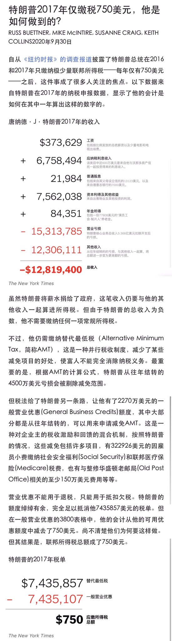 方舟子@fangshimin·Sep 29纽约时报公布了川普的$750是怎么来的。川普2017年的收入是负数,亏损1282万元,本来是不用交所得税的。但是国税局要求富豪们交不能计入以前亏损的“另外最低税”,川普为此需要交税7435857元,但他要求免税优惠7435107元,一减就是$750。2016年应该也是如此。这回那些骂纽约时报不懂税法的川粉傻眼了吧。https://pbs.twimg.com/media/EjIhUmMVoAAwznz?format=jpg&name=small