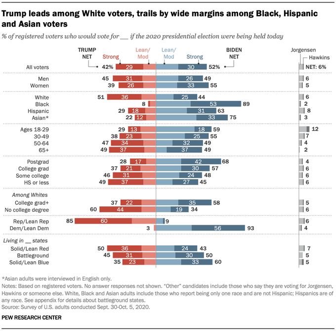 方舟子@fangshimin·Oct 11Pew最新调查结果,川普在白人选民中依然领先拜登(51:44),但比2016年掉了7个点(58:37)。他主要仍然是靠没有大学学位的白人支持(60:34),但比2016年掉了7个点(67:28)。今年没有大学学位的白人选民比上一届又少了一些,川普要再靠他们来获胜又困难了一些。https://pbs.twimg.com/media/EkFPCF0U8AAlYb9?format=jpg&name=small