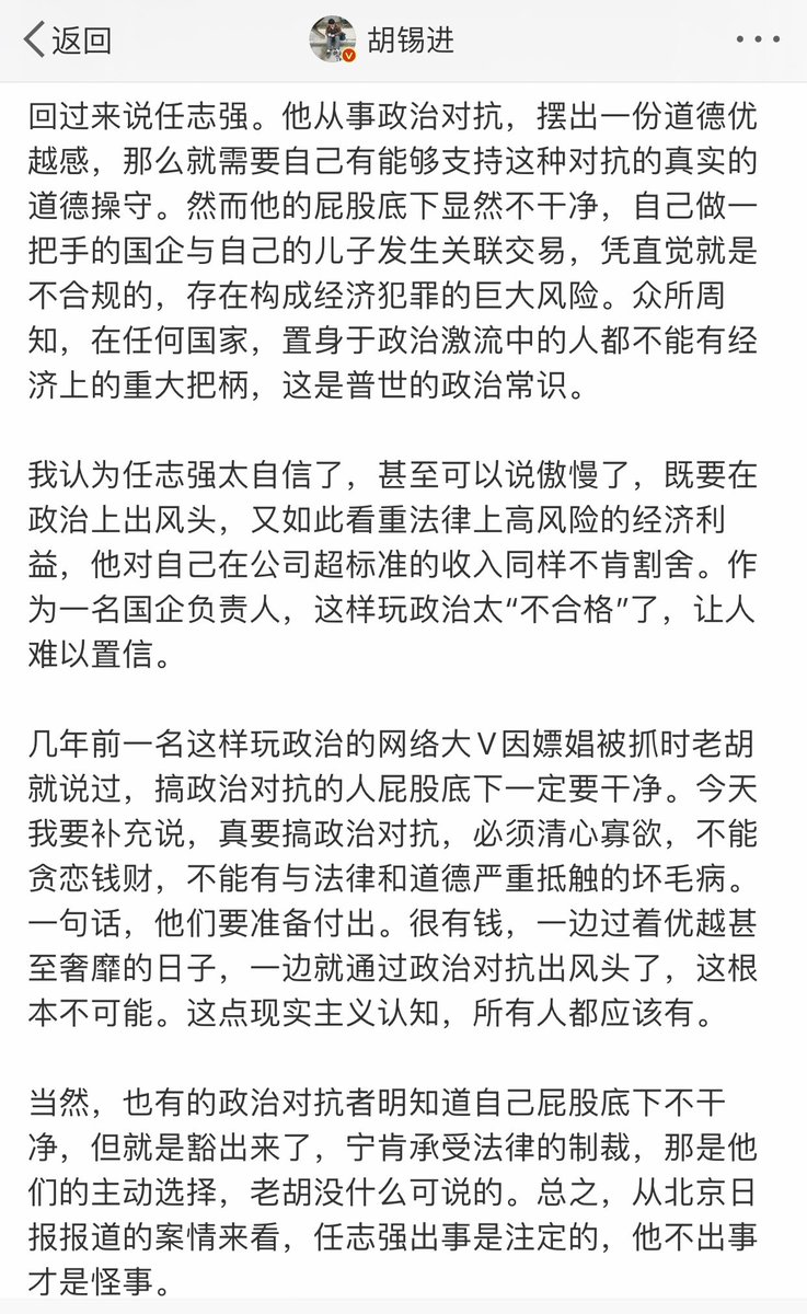 方舟子@fangshimin·Oct 12胡锡进泄露国家机密了,居然说任大炮是因为搞政治对抗被抓的,经济问题只是把柄,听上去他还很惋惜这些搞政治对抗的人屁股不干净。没有政治问题也有嫖娼问题,没有嫖娼问题也有间谍问题,即使啥问题都找不到也有万能的寻衅滋事在等着你。https://pbs.twimg.com/media/EkJ4iftU0AAyNH6?format=jpg&name=medium