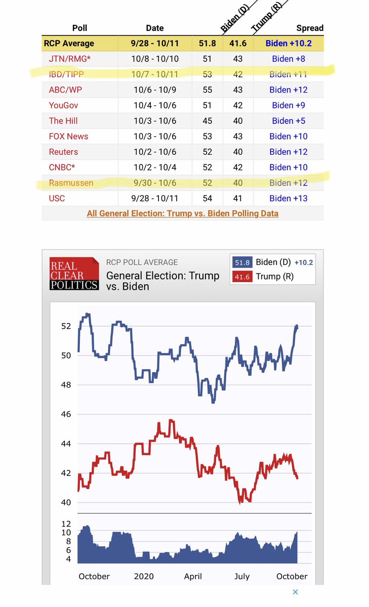 方舟子@fangshimin·Oct 12美国上届大选大多数民意调查结果最后都是希拉里微弱领先,有两个民意调查结果是川普微弱领先,因此他们自称最准确。现在这两个民意调查机构IBD和拉斯姆森都“叛变”了,结果分别是拜登领先11个点和12个点。川普、川粉现在连一个支持的民意调查机构都找不到,只能找网络投票和垃圾模型预测安慰自己。https://pbs.twimg.com/media/EkLK3wKVkAAyDB1?format=jpg&name=medium