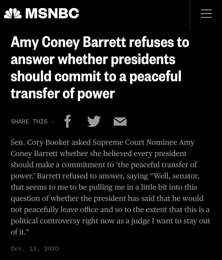 方舟子@fangshimin·Oct 14布克参议员问巴雷特法官,她是不是相信每个总统都应该保证和平移交权力?巴雷特说:这是个有争议的政治问题,她作为法官不能回答这个问题。美国宪法规定的、美国人引以为豪的权力和平交接都成了有争议的了。更让人相信川普推这个一问三不知、连法律常识都答不出的木头人当大法官就是为了不和平移交权力https://pbs.twimg.com/media/EkUO9tzU4AAc5Ih?format=jpg&name=900x900