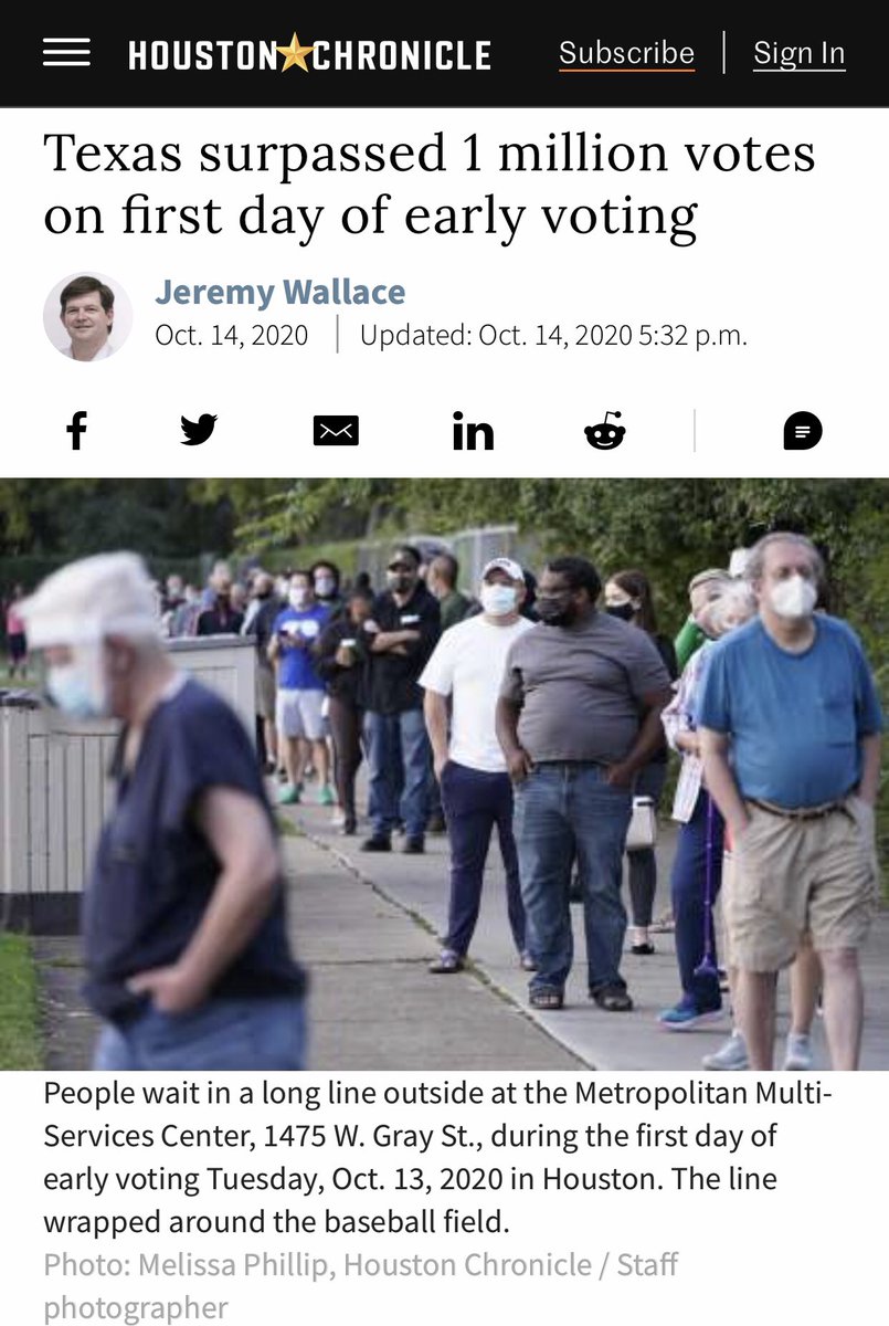 方舟子@fangshimin·Oct 13今天是得克萨斯提前投票第一天,投票站前一大早排起长队。昨天是佐治亚提前投票第一天,有人排队10小时才投上票。这些今年变摇摆州的红州共和党指望着通过打压投票来保住权力。得州州长一个郡只能有一个投票箱的行政命令被联邦法院叫停后,他去上诉,三个川普任命的上诉法院法官一致判决支持其行政命令https://twitter.com/i/status/1316177150647566337