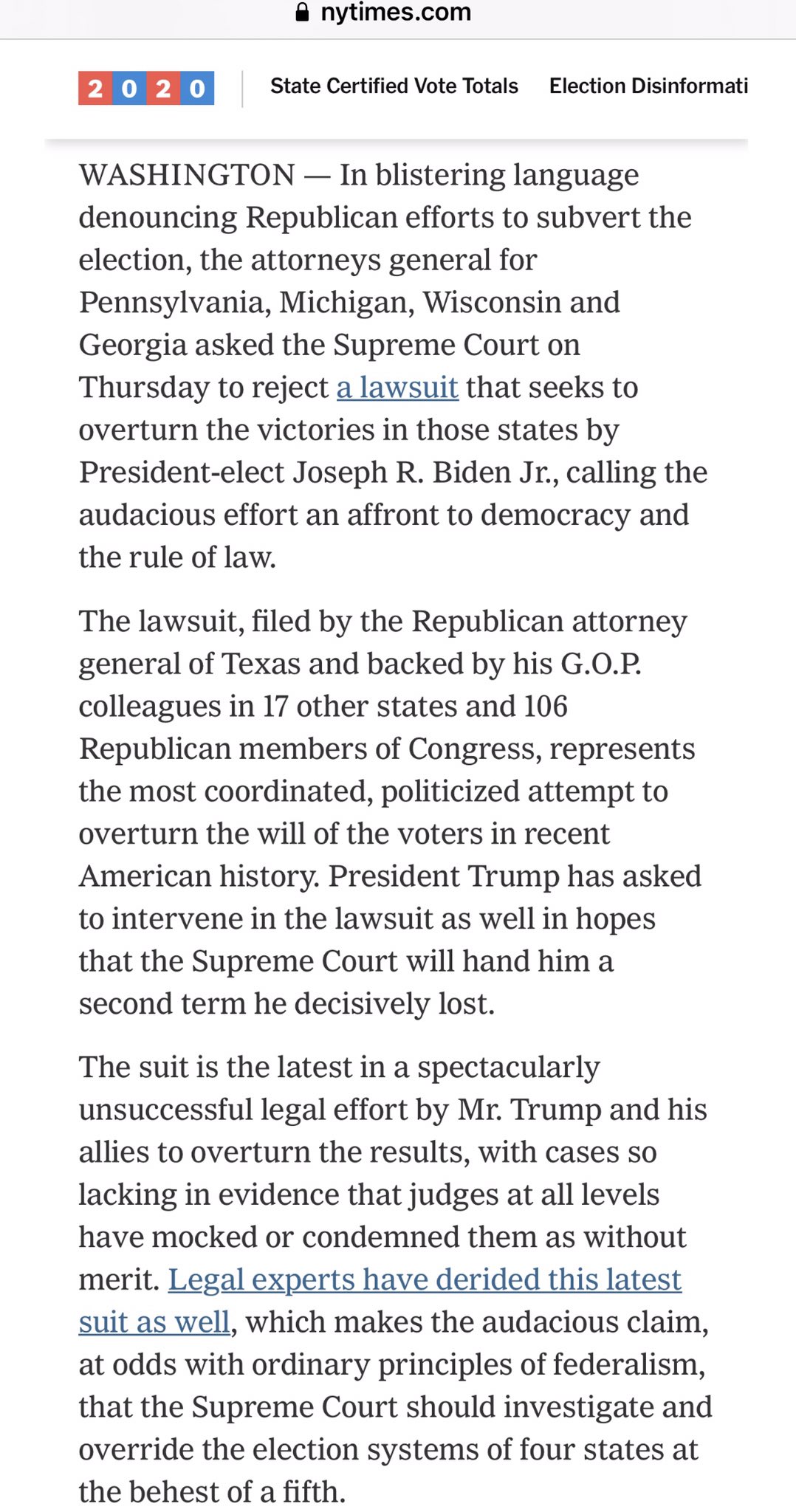 方舟子@fangshimin·Dec 8得州政府去美国最高法院起诉宾州、密歇根、威斯康星、佐治亚州政府,声称他们的选举程序违法,要求判决这四州的选举结果无效。连别的州怎么搞选举得州都要管,这是把自己当州级警察?最高法院应该不会受理这种滥诉,得州共和党这是用这种方式向川普表忠心。https://pbs.twimg.com/media/EovqAL_VoAASJPT?format=jpg&name=360x360https://pbs.twimg.com/media/EovqAMAUcAAy5ww?format=jpg&name=smallhttps://pbs.twimg.com/media/EovqAL_VgAAPA9n?format=jpg&name=smallhttps://pbs.twimg.com/media/EovqAMAVQAYdGY-?format=jpg&name=small