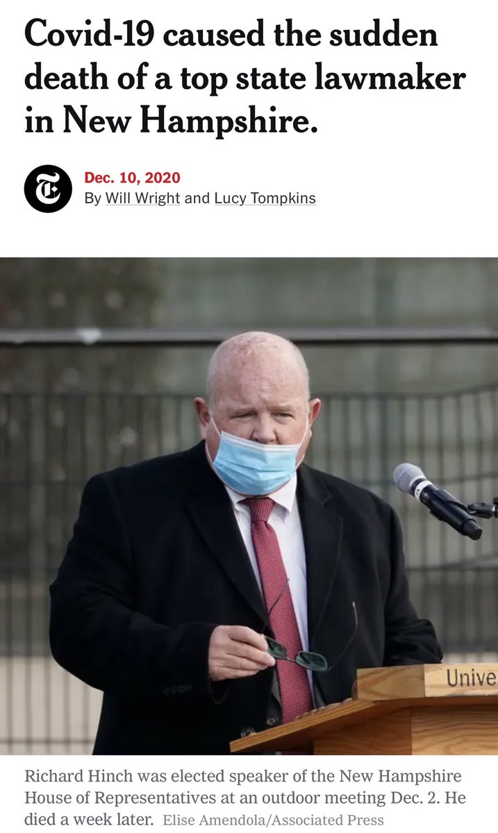 方舟子@fangshimin·Dec 10新罕布什尔州共和党州众议员上个月开了一次秘密会议,现在好几个被新冠病毒感染,刚刚就职一周的众议院议长因此病死。这应该是美国因为新冠病死的最高级别官员了吧?https://pbs.twimg.com/media/Eo7z-rsVEAAjnJ8?format=jpg&name=medium