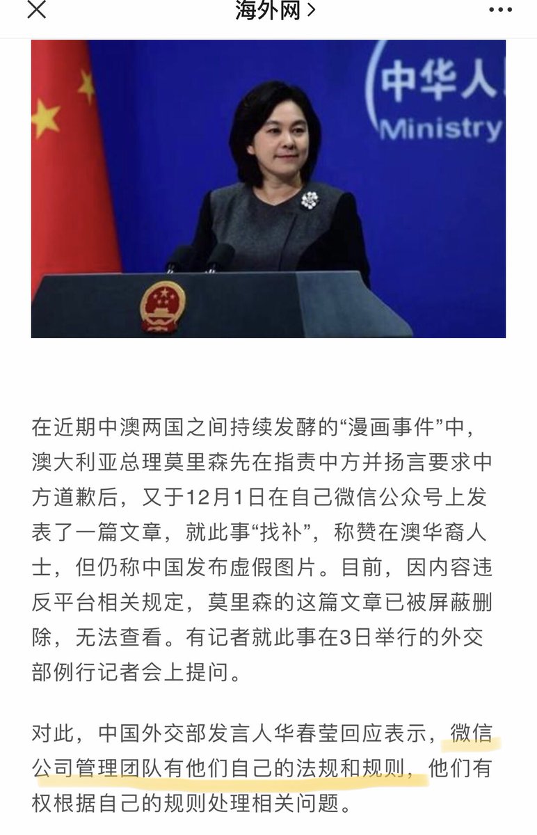 方舟子@fangshimin·Dec 2澳大利亚总理在其微信公众号发的这个帖子被腾讯删除,理由是:“该内容涉及使用煽动、误导、违背客观事实的文字、图片、视频等,捏造社会热点,歪曲历史事件、混淆公众视听。”大家研究一下指的是哪一句。https://pbs.twimg.com/media/EoSHXTIUUAAbF3W?format=jpg&name=large