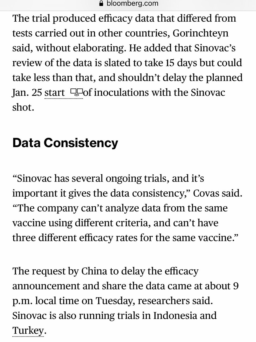 方舟子@fangshimin·Dec 23, 2020科兴公司要求巴西暂缓公布其新冠疫苗临床试验结果的理由据说是结果与其他国家的试验结果不符,要统筹一下。看来是因为巴西的数据不好,需要用土耳其、印尼的好数据弥补,那两个国家和中国一样,只要找到了关系或给够了钱,想要什么数据就有什么数据。巴西就比较讨厌,毕竟是民主国家。https://pbs.twimg.com/media/Ep-xiljVEAMEwX-?format=jpg&name=medium