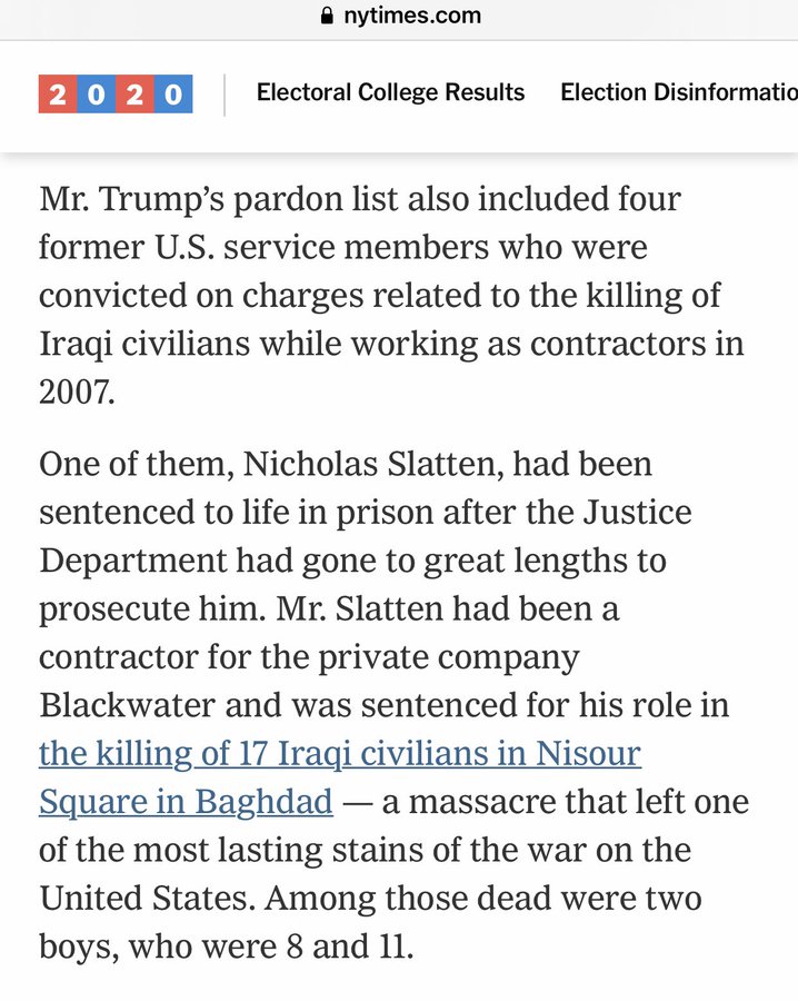 方舟子@fangshimin·Dec 22, 2020川普除了喜欢腐败的政客,还喜欢战争罪犯。今天他赦免的15个罪犯中包括4名黑水公司的保安,2007年在伊拉克屠杀了17名平民,包括2名男孩。他们去年才被定罪,开第一枪的那个被判处无期徒刑。今天川普将他们全部赦免。他下台前还会赦免一大批凶残的罪犯。这是一个没有人性的反社会人格疯子,川粉喜欢。https://pbs.twimg.com/media/Ep5Ptp2UYAADnSD?format=jpg&name=900x900