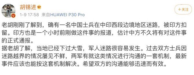 方舟子@fangshimin·Jan 9通天人物胡锡进能不能向中国军方建议一下,不要老是派一个士兵去巡逻,尤其是冰天雪地的时候?免得老是因为迷路被抓?https://pbs.twimg.com/media/ErVdevfU0AAtpMw?format=jpg&name=small