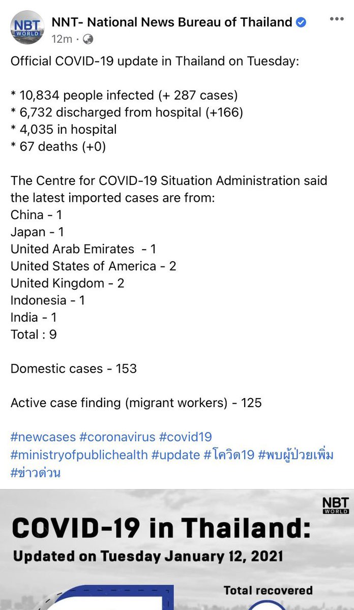 方舟子@fangshimin·Jan 12泰国今天新发现287个新冠病例,其中9个是外来的,1个来自中国。啥意思,中国现在还有病例输出?https://pbs.twimg.com/media/ErhQOBTVcAIdRjs?format=jpg&name=medium