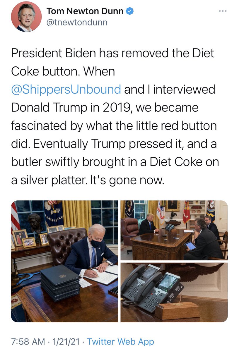 方舟子@fangshimin·Jan 22川普一天要喝12听可乐,当总统的时候专门在办公桌上装了一个“可乐按钮”,一按就有听差给他送可乐进来。拜登入主白宫干的第一件事就是把这个“可乐按钮”拆了。https://pbs.twimg.com/media/EsZa4pSVkAAlUwc?format=jpg&name=medium