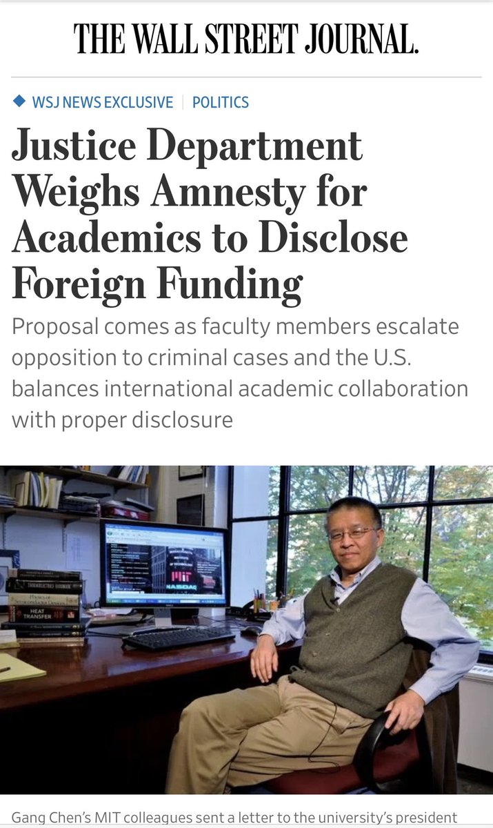 方舟子@fangshimin·Jan 24MIT校长有没有澄清陈刚入选“武汉高端人才计划”(一次性奖励200万元)和“光谷计划”(安家费1千万元,并可获得1亿元项目经费)也是学校与武汉的合作?以后华人教授要申请能源部和NASA经费会很难,人家担心你是不是隐瞒与中国的关系。那么败坏华人声誉的是抓人的FBI还是这些不自爱自重的华人教授?https://pbs.twimg.com/media/EsibBiOUYAEQpx3?format=jpg&name=large