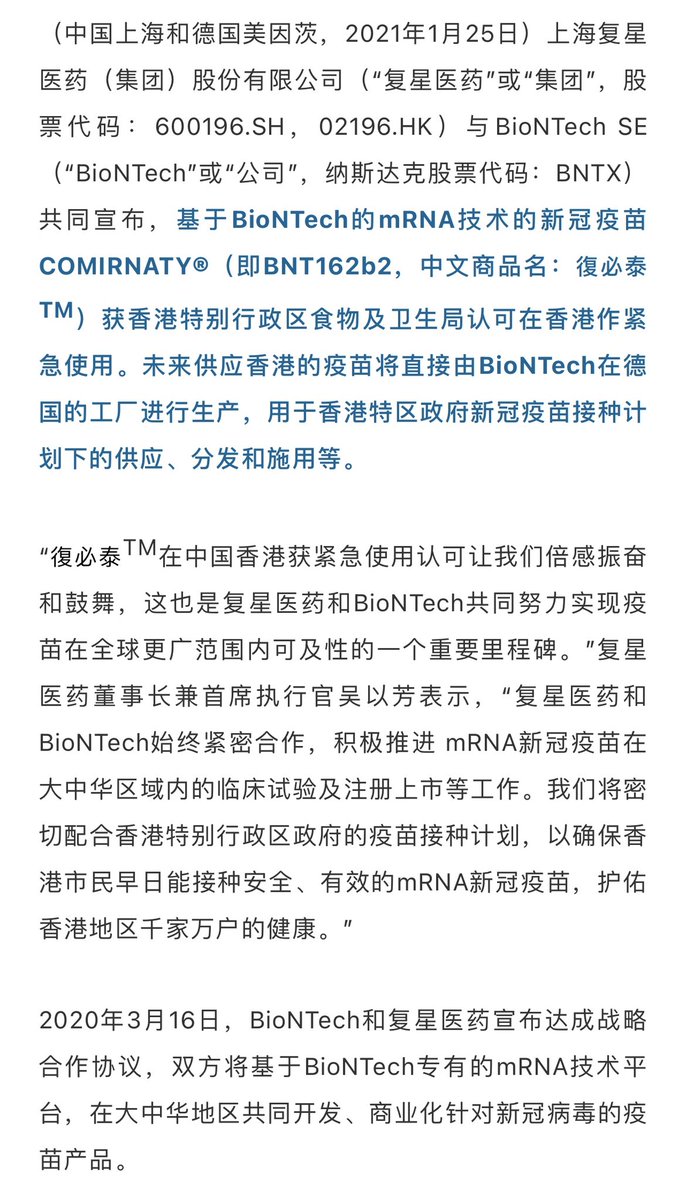 方舟子@fangshimin·Jan 27中国媒体造谣、抹黑了大半年的辉瑞疫苗,现在复星医药准备将它改个名称在中国上市,于是摇身一变,成了这款疫苗是中国科学家参与研发出来的。这么不要脸的抢功,也只有“中国科学家”干得出来。复星医药除了在辉瑞已经在做三期临床试验之后跟着做了毫无必要的一、二期临床试验,还干了啥?改名字?https://pbs.twimg.com/media/Esw4kXmUUAAHdVM?format=jpg&name=smallhttps://pbs.twimg.com/media/Esw4kXmU0AAyQtE?format=jpg&name=900x900