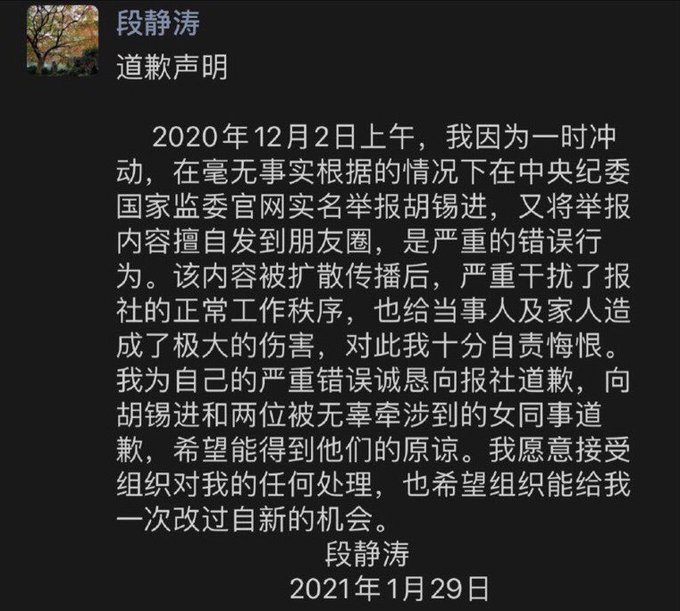 方舟子@fangshimin·Jan 30段静涛的道歉很不深刻啊,没有说明她为什么要牺牲政治前途诬告胡锡进。她只说是“一时冲动”,那么是因为什么原因一时冲动?而且按照胡锡进的说法,段静涛为搞倒他筹划了三、四年,举报前一个月还找他摊牌,肯定不是一时冲动。https://pbs.twimg.com/media/EtBODi-UYAEc7_8?format=jpg&name=small
