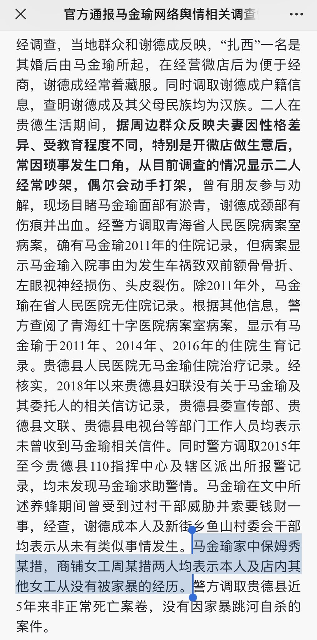方舟子@fangshimin·Feb 9贵德县政府说马金瑜以疫情为由不愿协助警方调查,马金瑜的律师说贵德警方以疫情为由不愿来取证。连谁拿疫情当挡箭牌都扯不清,这样的调查结果有什么可信的?另外,“扎西”谢德成的这篇文章写得比马金瑜的文章还通顺、有条理,像是一个普通话都不会讲的没文化的人写的吗?当地宣传部门代笔的吧。https://pbs.twimg.com/media/Et0gJjrU0AE8U3z?format=jpg&name=smallhttps://pbs.twimg.com/media/Et0gJjrUUAA1NeP?format=jpg&name=smallhttps://pbs.twimg.com/media/Et0gJjuVcAAo0fB?format=jpg&name=large