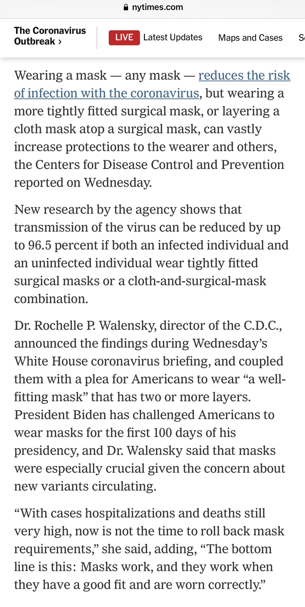 方舟子@fangshimin·Feb 10美国疾控中心开始建议戴两个口罩(一个外科口罩加一个布口罩),声称阻隔病毒传播效果达96.5%,比N95还好。我以前怎么说的来着,发现戴口罩没能防止更大的第二波疫情就戴两个口罩,以后发现两个口罩不行就戴三个口罩……幸好有疫苗了,可以很快放弃对口罩的痴迷。https://pbs.twimg.com/media/Et5WbWhVgAALCep?format=jpg&name=large