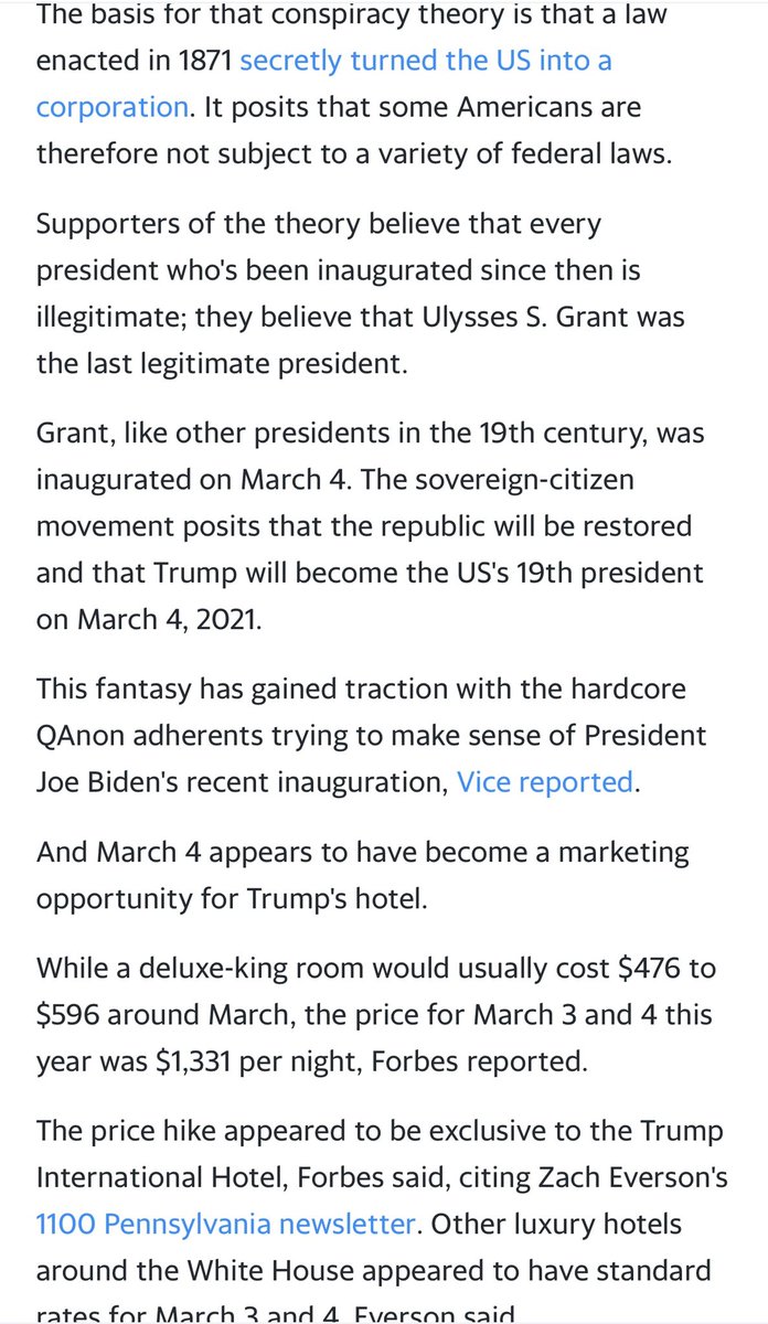 方舟子@fangshimin·Feb 10川卫兵又准备在3月4日搞事,说川普将在那天就任美国第19任总统。最新的阴谋论是,格兰特总统之后美国总统改在1月20日就职都是非法的。华盛顿川普宾馆3月3-4日的价格已被川卫兵炒到是原价的3倍。难道川普要在那里就职?https://pbs.twimg.com/media/Et5hG9CVoAA6hEE?format=jpg&name=medium