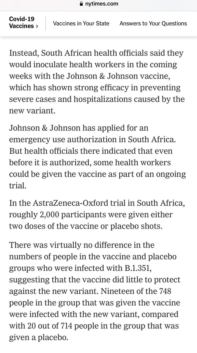 方舟子@fangshimin·Feb 7牛津/阿斯利康疫苗对南非变异的临床试验结果,疫苗组748人,19人被感染,对照组714人,20人被感染,表明牛津疫苗没法预防被南非变异感染,南非已停止接种该疫苗,改接种对该变异有一定预防能力的强生疫苗。https://pbs.twimg.com/media/EtrmXQpUYAErNG5?format=jpg&name=medium