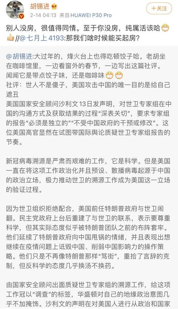方舟子@fangshimin·Feb 15胡锡进为什么骂网友没房纯属活该?大家都没房基本等于都有房吗?https://pbs.twimg.com/media/EuUOO88UYAIcQLF?format=jpg&name=medium