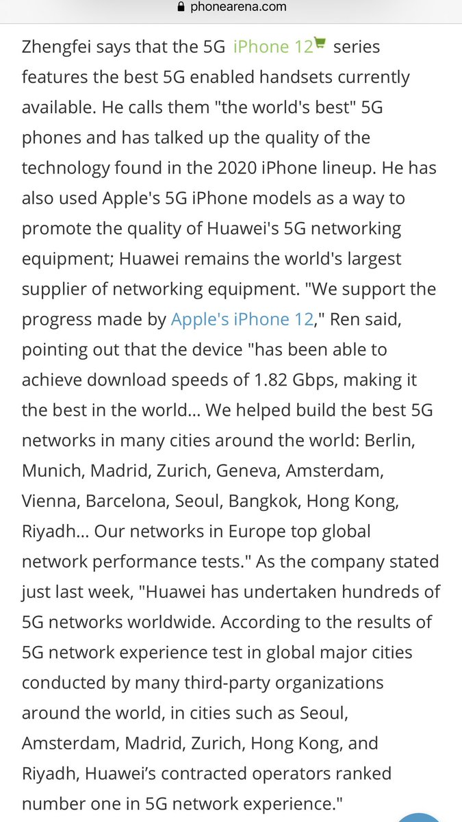 方舟子@fangshimin·Feb 15果粉任正非在国外替苹果手机打广告,说iPhone 12是最好的5G手机。爱国小将们赶快骂他。https://pbs.twimg.com/media/EuVBnKiUYAIfPSa?format=jpg&name=medium
