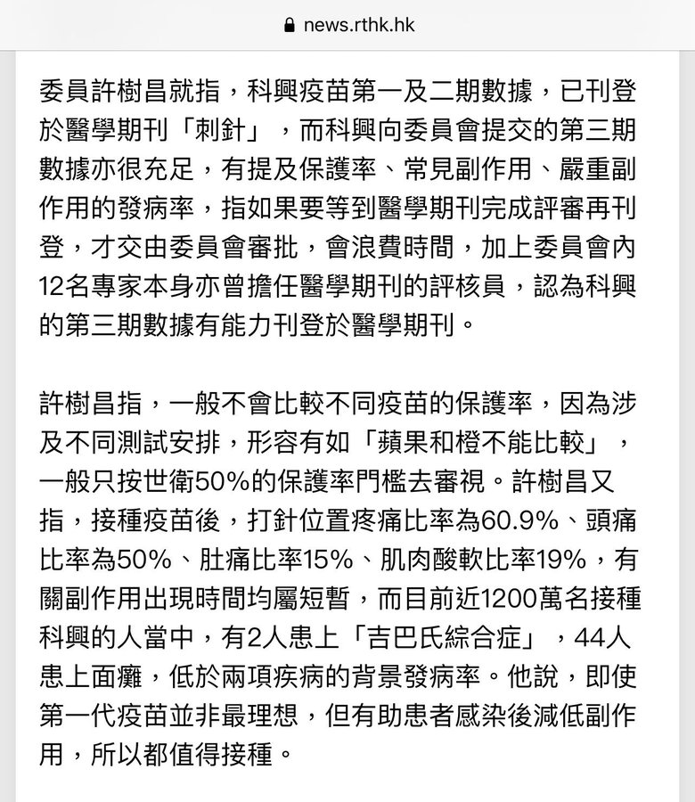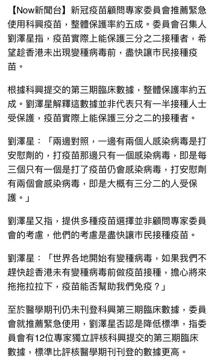 方舟子@fangshimin·Feb 17所谓科兴疫苗第二剂超过21天再打能让有效率从50%升高到63%,是根据1500人试验结果算出的,并无统计差异,但香港疫苗顾问专家委员会却据此推荐相隔28天再打第二剂。那个召集人刘泽星是一个风湿病医生,为什么找这种外行审核疫苗?因为他政治上靠得住?https://pbs.twimg.com/media/EufJ0dfVkAMZWwn?format=jpg&name=large