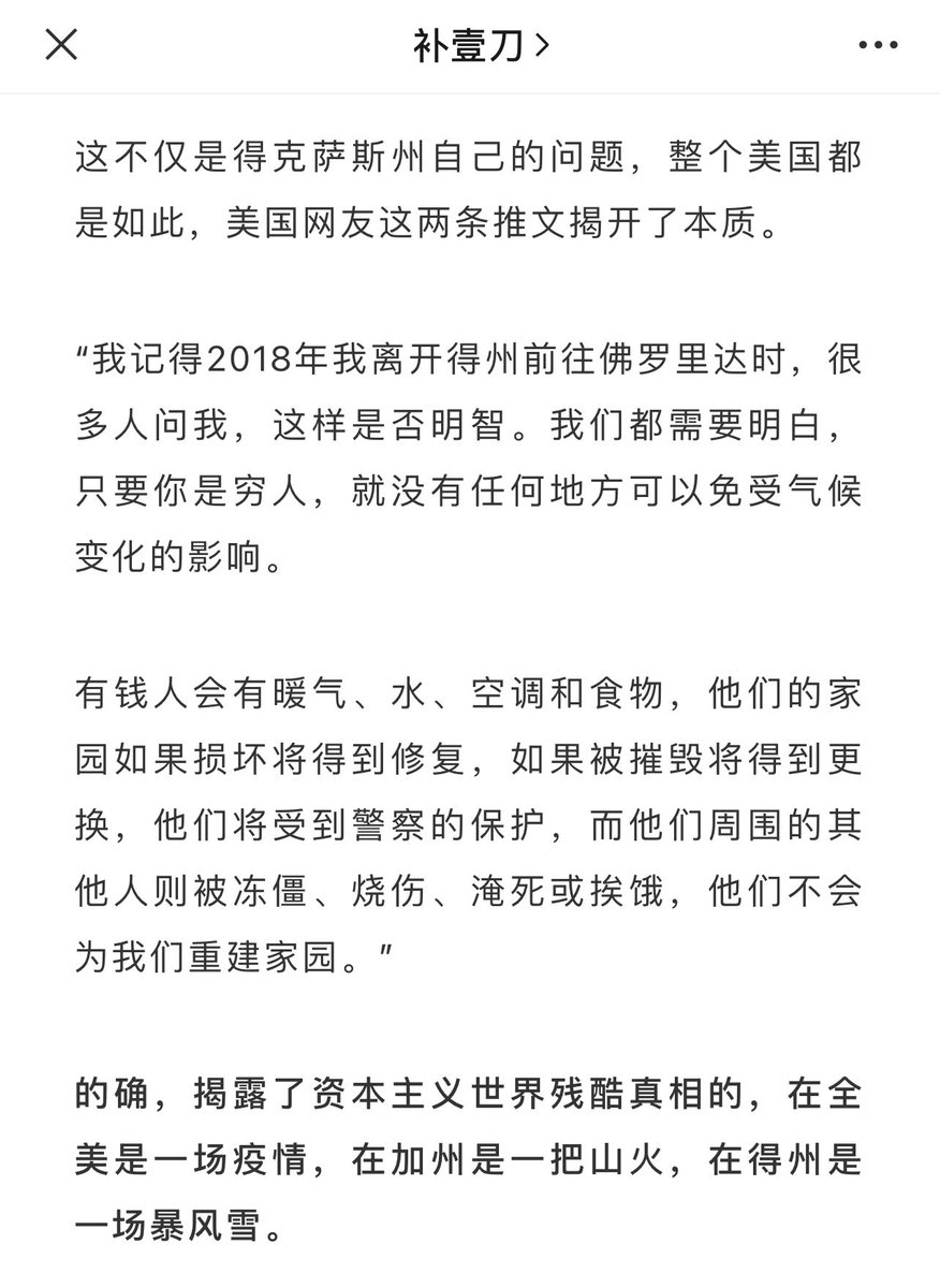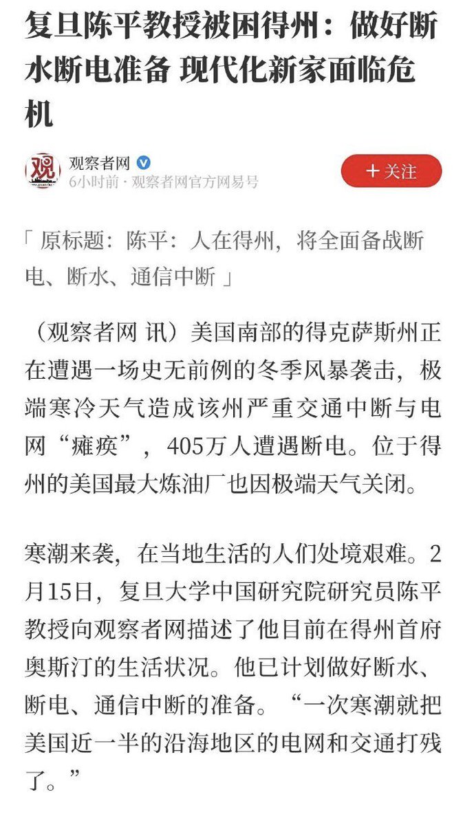 方舟子@fangshimin·Feb 18去年加州某些地方为预防野火停电的时候,得克萨斯的共和党政客是多么的高兴,以为抓住了一个攻击加州的机会。现在倒没见加州政客反骂回去。幸灾乐祸都是没人性的,不管是得州共和党政客还是环球时报枪手。https://pbs.twimg.com/media/EuiteYkVoAAtVEz?format=jpg&name=smallhttps://pbs.twimg.com/media/EuiteYmU4AAk51A?format=jpg&name=smallhttps://pbs.twimg.com/media/EuiteYlVcAQrDO9?format=jpg&name=360x360https://pbs.twimg.com/media/EuiteYlUYAEy0Lu?format=jpg&name=360x360