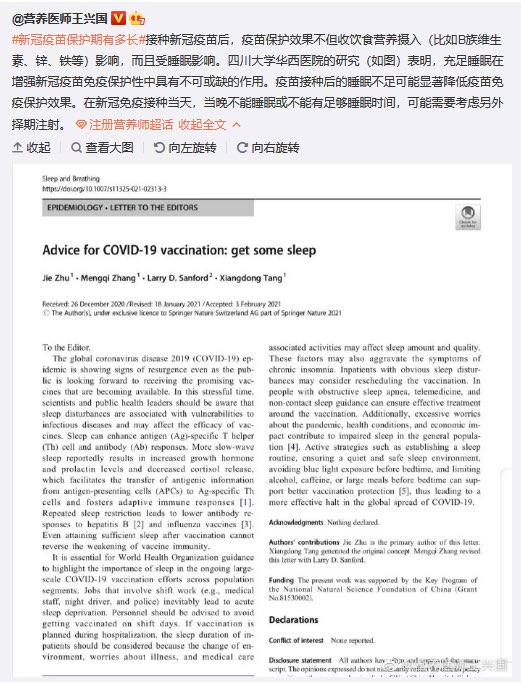 方舟子@fangshimin·Feb 23疫苗接种产生的免疫反应,并不是立即产生、完成的,跟接种当天有没有足够睡眠能扯上什么关系?这种违反科学常识的胡思乱想的读者来信还标准基金号,肯定是把读者来信当成论文作为学术成果了。https://pbs.twimg.com/media/Eu9hMmqVoAAbJ8h?format=jpg&name=900x900