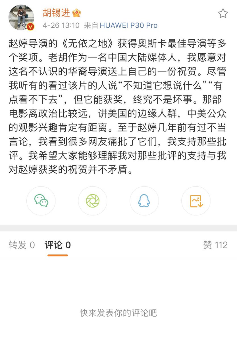 方舟子@fangshimin·Apr 25胡锡进假惺惺祝贺赵婷获奖,被删掉了。胡锡进这回政治嗅觉不够灵敏,没跟领导保持一致,要不要写检讨?为什么“赵婷”突然成了敏感词在墙内被消失,估计逻辑是这样的:奥斯卡有港片入围,辱华了,所以它的获奖影片、获奖者也都辱华了。https://pbs.twimg.com/media/Ez4CPoDVEAMprU9?format=jpg&name=medium