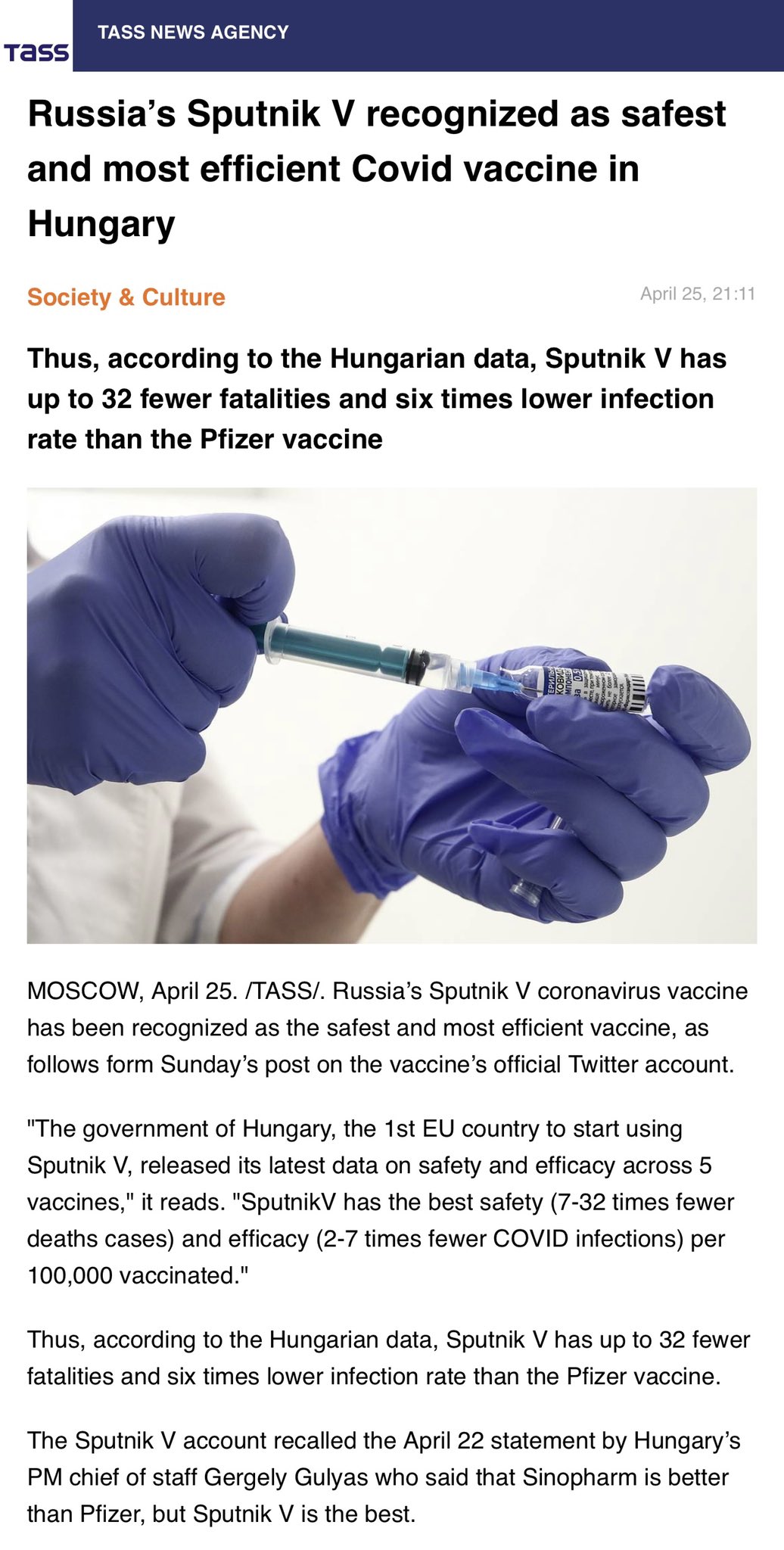 方舟子@fangshimin·Apr 26塔斯社宣布,根据俄国人民的老朋友匈牙利的使用数据,俄国疫苗是全世界最安全最有效的疫苗,俄国疫苗比辉瑞疫苗少死32人,有效性是辉瑞疫苗的6倍。这意思是俄国疫苗的保护效力是570%?要说敢吹牛,还得数胡锡进的精神祖国。https://pbs.twimg.com/media/Ez8hFlKVUAMfVZF?format=jpg&name=large