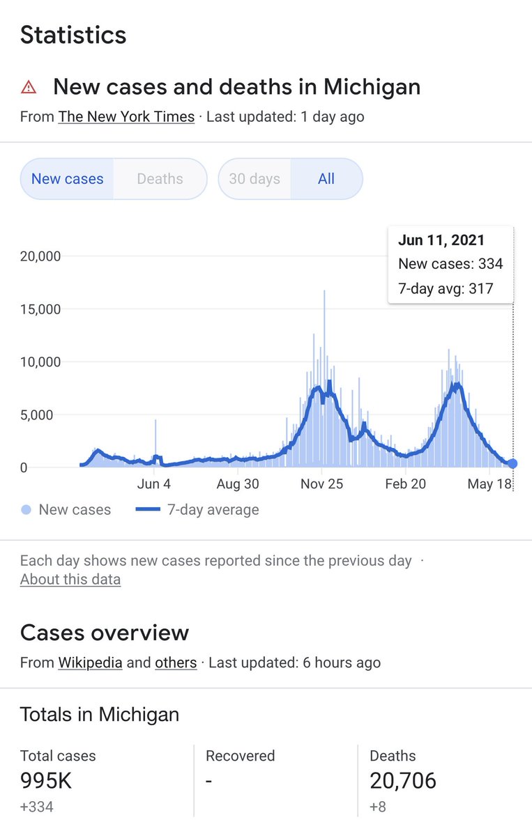 方舟子@fangshimin·Jun 12两个多月前密歇根病例直线上升时,密歇根州长顶住媒体舆论压力,坚决不再搞封城,而是加速疫苗接种。现在密歇根疫情也过去了,出现了完美的曲线。相信好的疫苗必然能够预防感染战胜疫情,这才是科学的态度。https://pbs.twimg.com/media/E3uDk5hVEAENBKL?format=jpg&name=medium