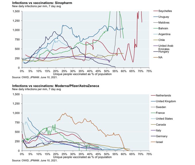 方舟子@fangshimin·Jun 13摩根大通公司新发布新冠研究报告,对比大规模接种国药疫苗(上图)和接种辉瑞、莫德纳、阿斯利康疫苗(下图)的国家的疫情,赤裸裸反华,不想在中国做生意啦?https://pbs.twimg.com/media/E3yervPVIAA8-Er?format=jpg&name=small