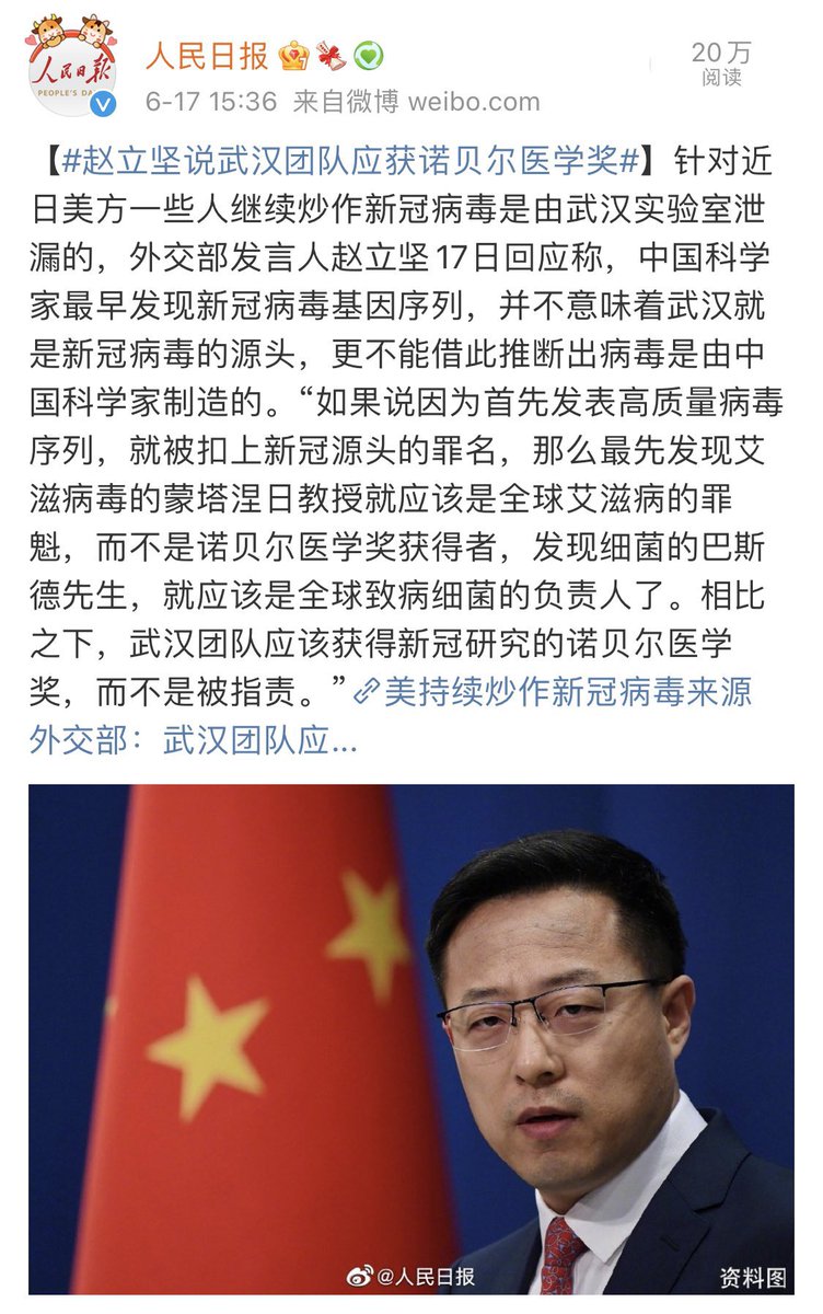 方舟子@fangshimin·Jun 17赵战狼说,武汉团队应该获得诺贝尔医学奖。幸好诺贝尔奖不是中国发的,否则大领导一说发奖,就发了。https://pbs.twimg.com/media/E4H9yfZVIAADsyh?format=jpg&name=medium