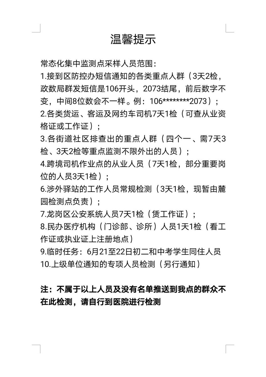 方舟子@fangshimin·Jun 20定了,深圳龙岗区核酸检测常态化,各类重点人群每三天测两次核酸,休息一天。深圳测核酸生意应该不属于钟南山,属于华大基因吧?https://pbs.twimg.com/media/E4WvwcXVIAAXYW3?format=jpg&name=medium