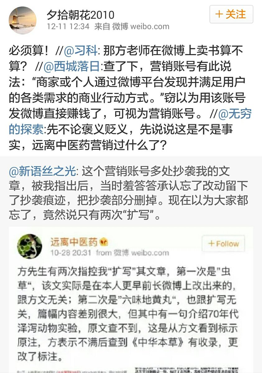 方舟子 ?@fangshimin Dec 11 指望靠“专职黑中医药”赚钱,曾经跪求打赏,当然是营销号。这种投机分子败坏着批评中医的名声。@look1m 营销账号为盈利而存在,是盈利平台。但并非说有营销行为就是“营销号”。远离中医药 注册时号称“专职黑中医药”,现在虽还在批评中医药,但已经变成“码字换钱”的工具,当然是营销号。